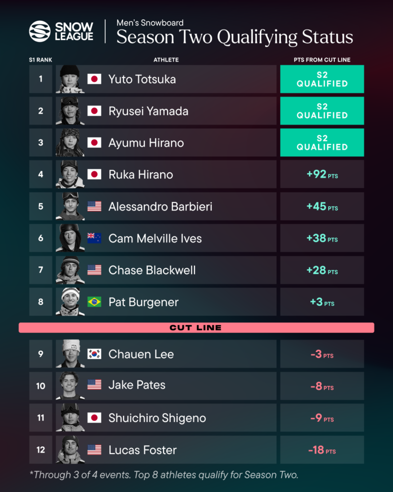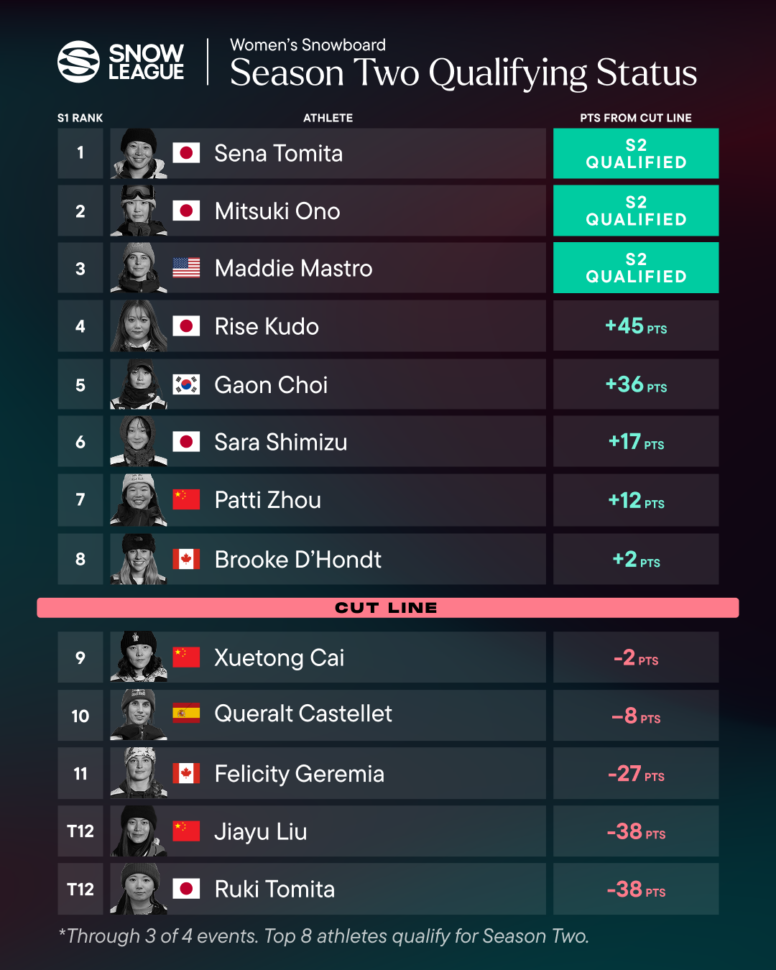 American favorite Maddie Mastro remains a serious contender in third place with 175 points, though her path to the championship requires a victory in LAAX coupled with much lower finishes from Tomita and Ono. Armed with her signature double crippler and back-to-back podiums in Aspen, Mastro has already qualified for Season 2 of the Snow League along with Tomita and Ono. 16-year-old standout Rise Kudo has surged into fourth place following strong performances in China and Aspen and could tie Sena in the overall standings being down by 100 points exactly with a top finish in Laax. Fifth-ranked Olympic gold medalist Gaon Choi will unfortunately miss the LAAX finale as she continues to recover from her fall at the Olympics, but will probably secure a top 8 overall as long as the podium isn’t too shook up.