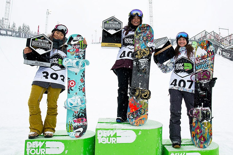 Chinese rider Liu Jiayu did the best job of adjusting to the variable conditions, who found herself for on the Dew Tour podium for the first time. To keep things simple, she was stoked to be there alongside Chloe Kim and Kelly Clark, and just to be out here snowboarding. Top qualifier Arielle Gold wasn’t able to put together a podium worthy run, but she will undoubtedly remain a competitive force as we continue into the 2015/16 season. Continue reading to watch Liu, Chloe, and Kelly’s runs and see the full results below.
