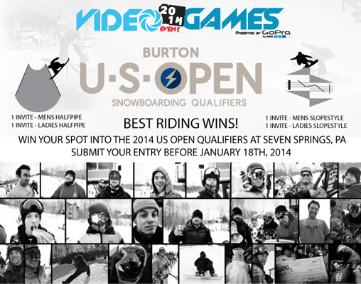 For the 2014 season VGE is happy to announce the special invites from BURTON for the US OPEN Qualifiers event in Seven Springs, PA on January 31st-February 2nd. If you missed out on the registration deadline, or your having a hard time getting to Seven Springs… you should enter to win.