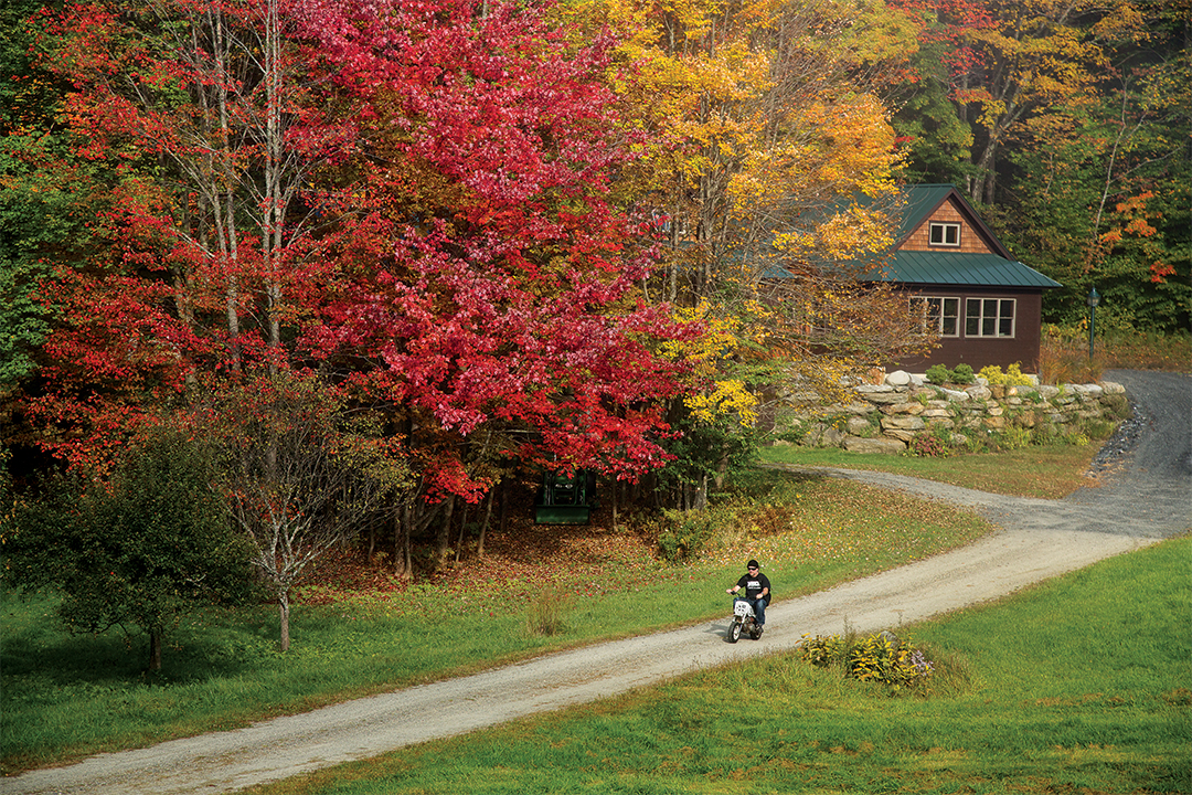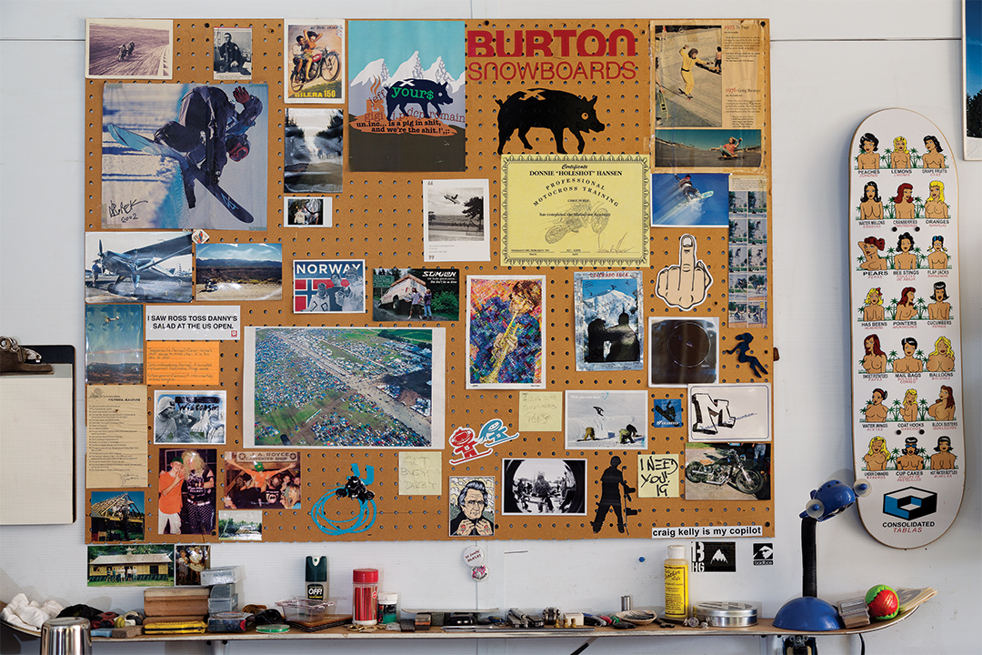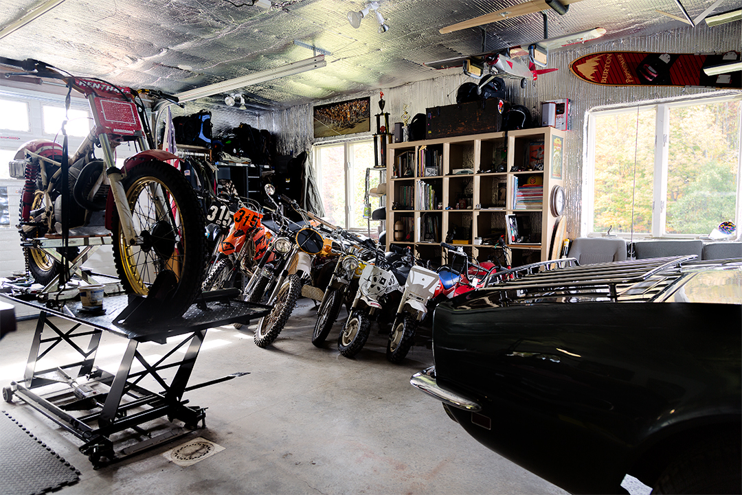 I dreamed of having my own workshop where I could do my own thing for so long. I’ve never had my own garage. So to have this place is awesome. When Legh decided to build this place I was part of the crew that built it. He made some really unique features; the roof rafters in the workshop are harvested from trees that he planted when he was 11-years-old. He peeled off all of the bark and they are so straight, it’s astonishing. He scavenged a vent off an old barn in Wolcott that I put up on the main part of the shop, and we have an old windmill up on the other part of the shop. It powers a pump which aerates the pond to keep it alive. Legh built the inside to look like his old motorcycle shop. So all of my workbenches are out of the old shop, Cycle Works, and I have the old Cycle Works sign. So all of a sudden the old shop is now mine, which is so insane and so cool! I decorated it with everything that meant something to me. I have my snowboard-tuning zone, my motorcycle zone; I built Sandy a workbench so she has a zone. Cause this is not a “No Girls Zone”, girls are allowed and welcome! It’s heaven, it’s my favorite place, it’s where I’m happy. There is a big-ass apple tree out front and we made 17 quarts of applesauce just this year off of that one tree!