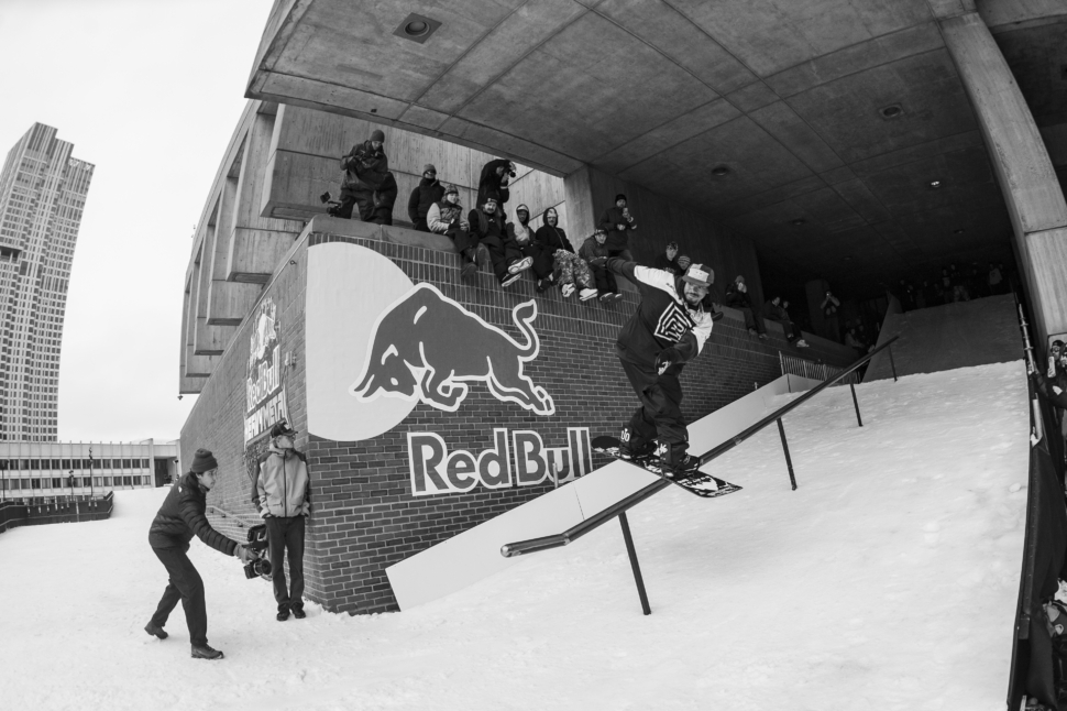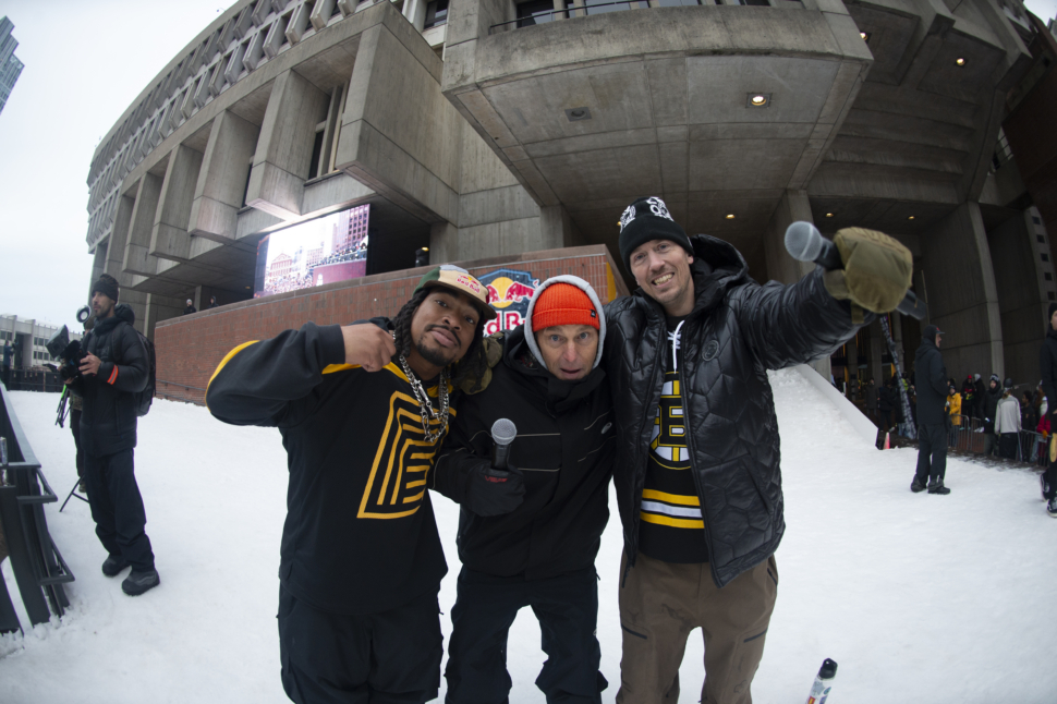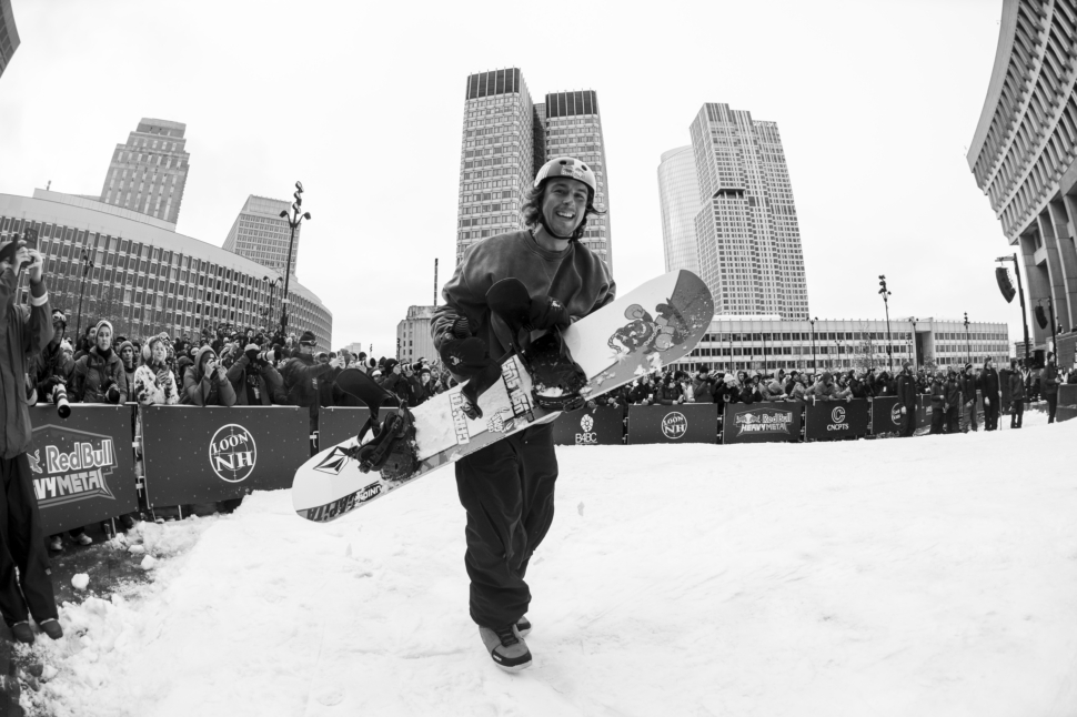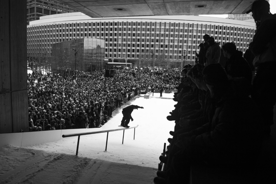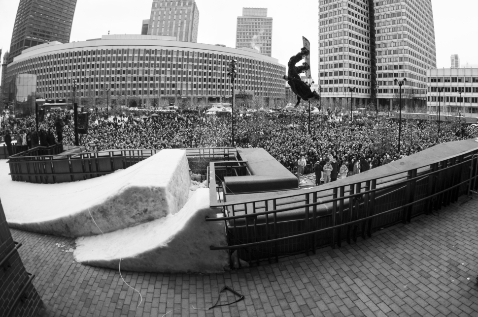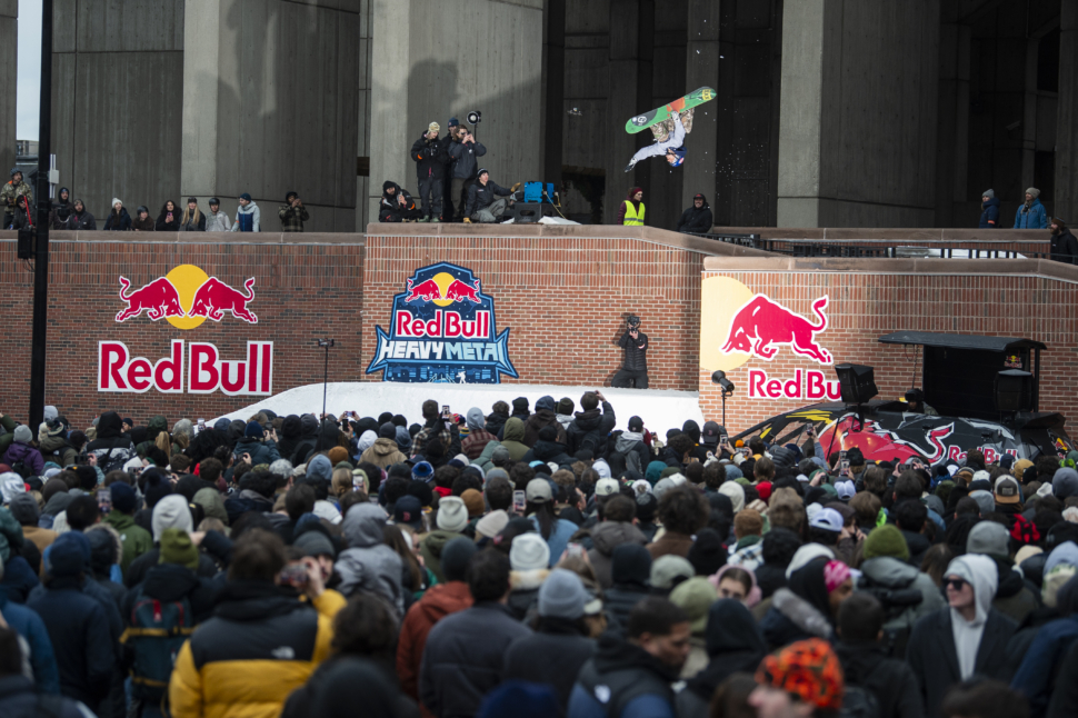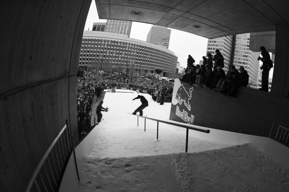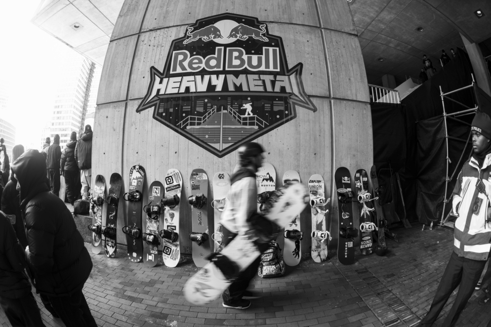 By now, you probably know what Red Bull Heavy Metal is if you are spending time a snowboard website. But if you don’t, it is exactly what it says it is… with a little airtime added in for good measure. Right before the storm that is currently hammering the city and trapping anyone who was too hungover to get out before noon yesterday, Red Bull put on the signature event at City Hall Plaza in the heart of Downtown Boston. It was quite the Saturday. A ton of tricks, a ton of bails, a handful of lands, and a few trips to the hospital. The crowd threw snowballs despite Todd Richards and the announcing crew (Chris Grenier and Alex Caccamo) pleading for them to stop, and everyone who didn’t get hit in the face seemed to have a great time.