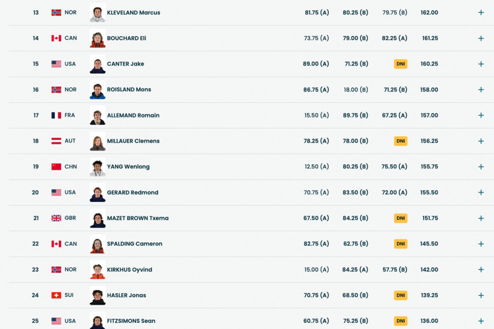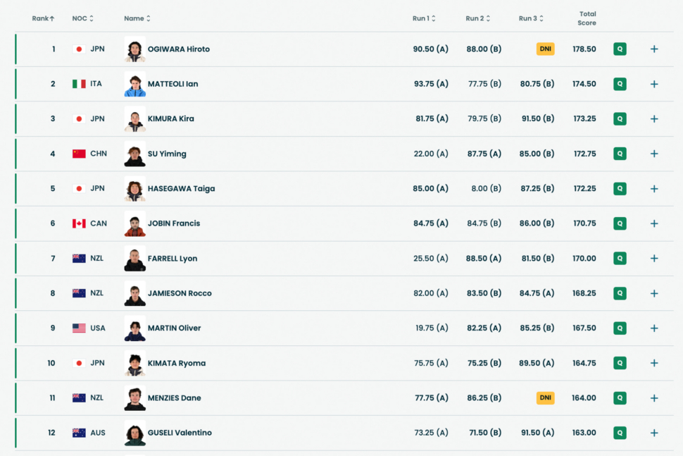 The third and final runs of qualies are by far the most exciting. You obviously have the drama of seeing how it all shakes out, but even for those that are already mathematically eliminated, this is where you get to see some style and hopefully a nice method or two. USA’s Jake Canter fell to kick off the final attempts, which forced him to sit and wait to see if he would survive the onslaught of the rest of the field. Kira Kimura put down a massive 1980 to punch his ticket to finals. Red Gerard improved on his score on run three but only enough to hold his spot near the bubble in 11th place with 20+ riders to go. After Taiga Hasegawa put down an 87.25 and moved into final contention, Japan took control of the top three, which feels about right for a representation of this discipline over the past few winters. Ollie Martin then followed with an 85.25 (landing a clean 1800) to move into the top twelve and knock teammate Red Gerard out of finals day. Yiming Su put down a switch backside 1980 to keep his Olympic dream alive, easily jumping into the top twelve for a chance to defend his gold medal (and knocking Team USA’s Jake Canter out of contention for finals along the way). Sean Fitzsimons needed an 86.00 to make the top twelve on his last drop, and although he got to his feet he could not improve on his score to advance. Valentino Guseli, with less than a 24 hour noitce that he would be competing in Big Air put down a massive switch backside 1980 and screamed, “ARE YOU NOT ENTERTAINED?!” as his 91.50 score came in to just squeak him into finals on Saturday. Oh, and Lyon Farrell also landed the final run of the contest with an 81.50, which combined with his 88.50 from run two bumped Marcus Kleveland out of the top 12 and secured all of New Zealand’s team a spot to advance.